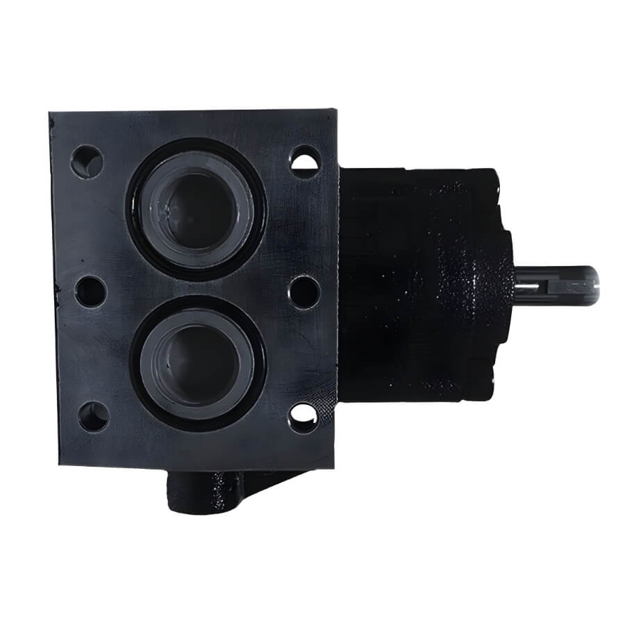 A entrada de óleo pela parte superior facilita a instalação e melhora o fluxo interno, reduzindo perdas e aumentando a eficiência hidráulica.